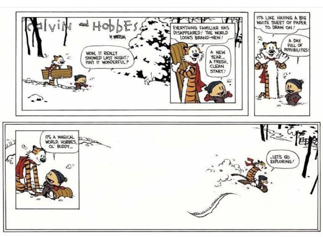 Let’s rise in freedom together by exploring ourselves and the world: what makes us tick, how this magical universe works, and how to be the best version of ourselves we can be. Twenty-six years ago the comic strip Calvin and Hobbes by Bill Watterson published its final piece, which I share with you here. Although in one sense there may be nothing new under the sun (or snow), this moment is a fresh, clean start, full of possibilities in a magical world. Let’s go exploring together!